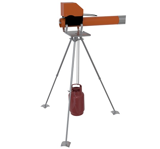 Стойка представляет собой устойчивую конструкцию с площадкой для крепления отпугивателя и тремя телескопическими ножками, высота которых регулируется для подстройки под тип поверхности. Площадка, на которой установлена гром-пушка, автоматически поворачивается при каждом выстреле на небольшой угол (15 - 30 градусов). Таким образом происходит вращение устройства вокруг своей оси на все 360°, что значительно увеличивает площадь действия отпугивателя.